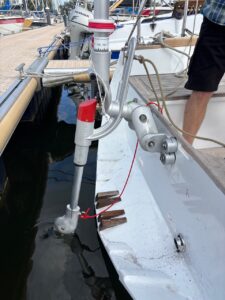 Dear Peter, Yesterday I installed my new windpilot. We had a short sail and were delighted with the results. I still need to do some tweeking. The placing of the control lines are not ideal yet but will be soon improved. My transom is not so high so I had to turn the bracked all the way upwards. Still the boldt holding the rudder blade was only about 2 centimeters above the water. What do you suggest? Is this allright? Or is it possible to shorten the tube (420/421) going down to the rudder? I can also tilt the pilot back a bit to raise the bolt a bit out of the water but this will lead to the upper part of de pilot not being totally plum. Looking forward to your opinion.